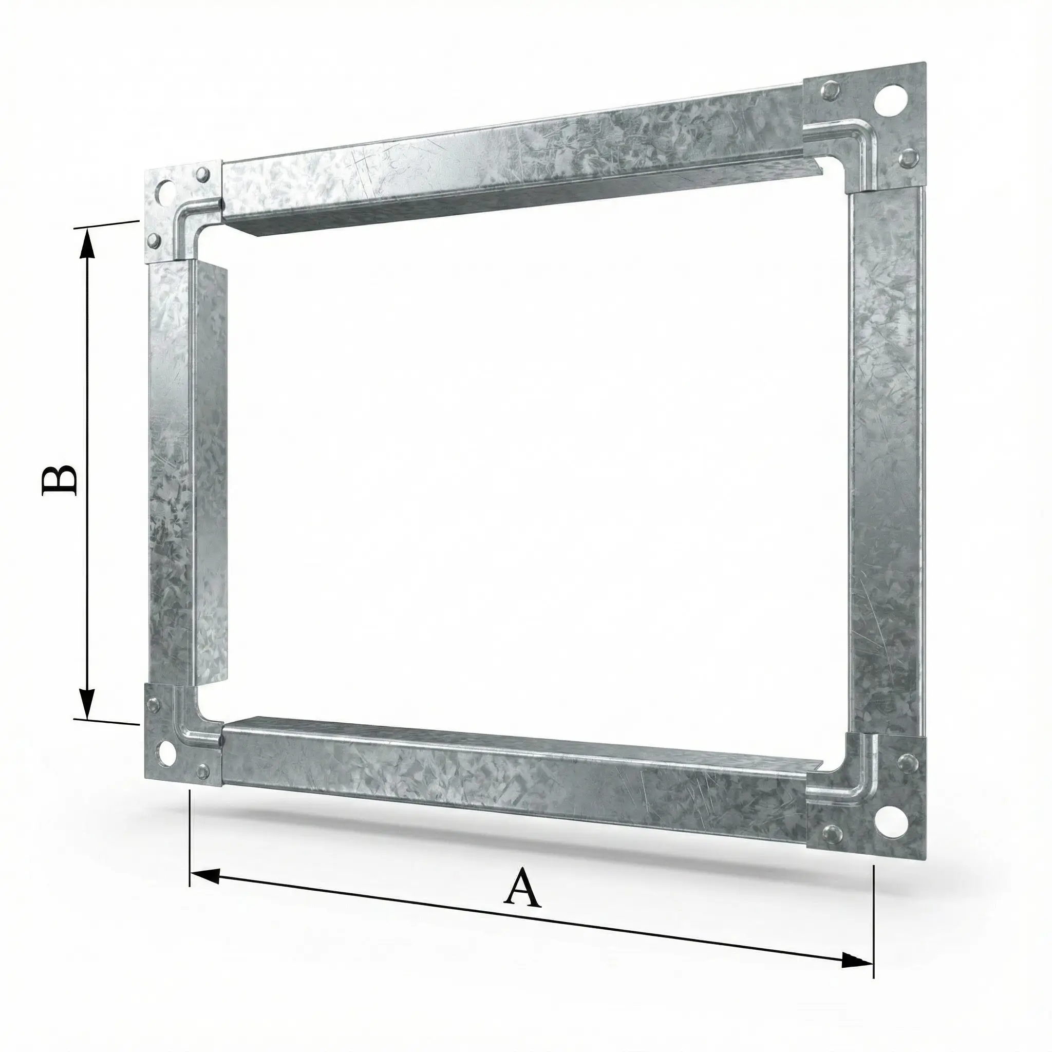 Вентиляционный фланец из шины No30 представляет собой готовую сборочную единицу — прямоугольную рамку, изготовленную строго по размерам сечения воздуховода (A×B). Конструктивно изделие состоит из четырёх отрезков монтажной шины профиля No30 и четырёх оцинкованных уголков (УГФ-0), жёстко зафиксированных в углах методом пуклёвки. Фланцы №30 применяются при соединении воздуховодов увеличенного сечения, подключении вентиляционного оборудования, клапанов и гибких вставок.